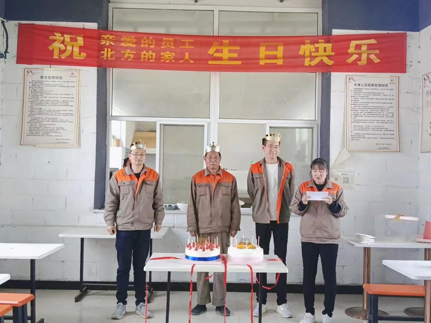 公司食堂準備了豐盛可口的飯菜,公司準備了生日蛋糕,董事長發(fā)表講話,并為過生日的同志送上生日祝福,公司員工聚在一起唱生日歌,分享生日蛋糕。大家都覺得十分幸福,因為我們是相親相愛一家人